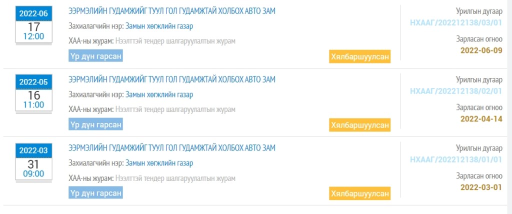 Энэ автозамын ажлаар гурван удаагийн тендер зарлаж байж үр дүнд хүрсэн байна.