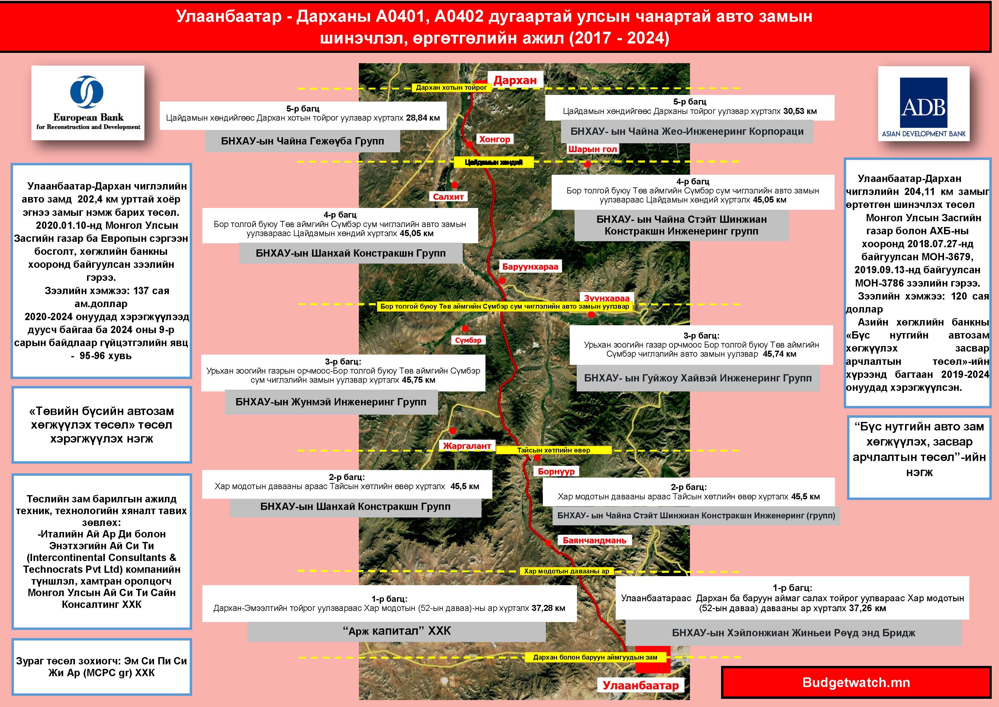 Зам, тээврийн хөгжлийн яамнаас Улаанбаатар-Дархан чиглэлийн 204 км замыг 5 хэсэгт хувааж сонгон шалгаруулалт явуулж тус бүрт нь компаниудтай гэрээ байгуулсан байна. Үүнд: