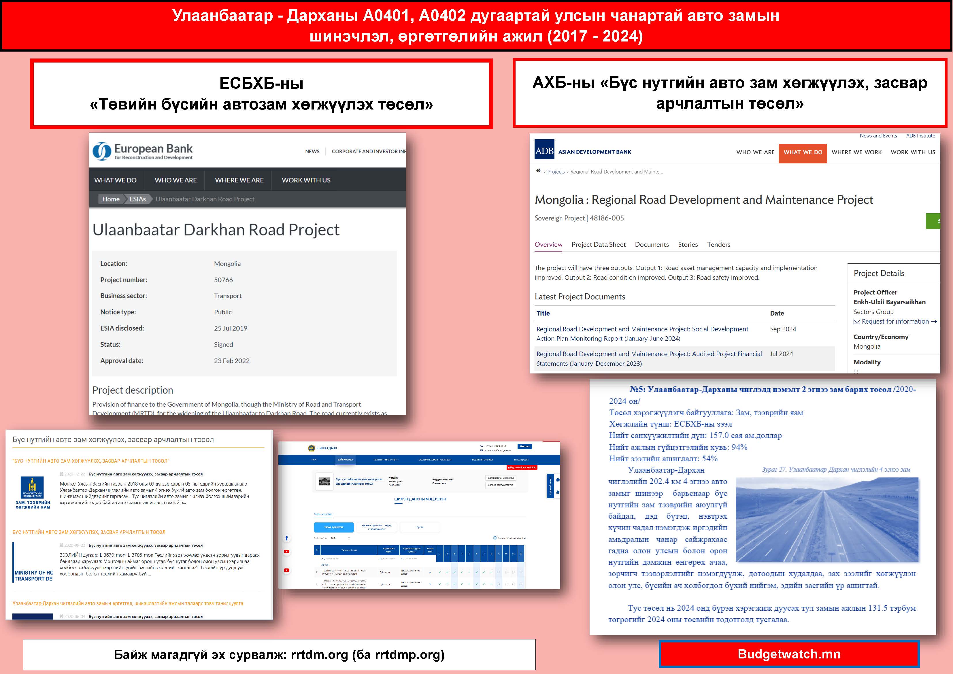 Нэгдүгээр үе шат буюу Улаанбаатар-Дархан аймгийн автозамын хоёр эгнээг сэргээн засварлах: АХБ-ны зээлээр санхүүжүүлэх “Бүс нутгийн авто зам хөгжүүлэх, засвар арчлалтын төсөл”-ийн Улаанбаатар-Дархан чиглэлийн авто замын өргөтгөл, шинэчлэлтийн ажил” МОН-3679 төсөл – 60 сая ам.доллар (үүнээс 58.5 сая нь хөнгөлөлттэй зээл 1.5 сая нь буцалтгүй тусламж) + 60 сая доллар.