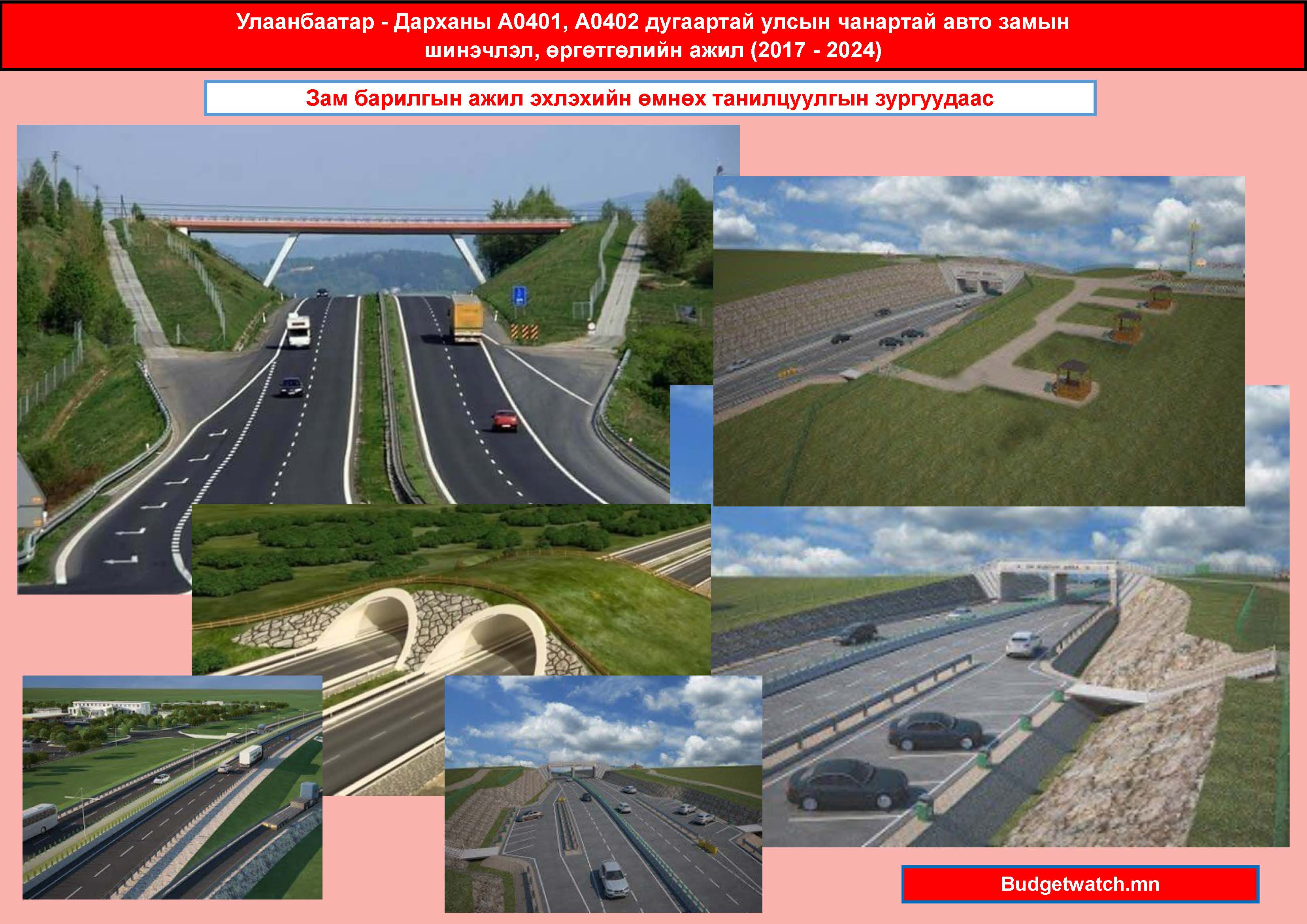 Улаанбаатар хотын баруун аймаг салах уулзвараас Дархан хотын урдах тойрох уулзвар хүртэлх А0401, А0402 дугаартай, 204 км урттай улсын чанартай авто замыг шинэчлэн засварлахын хоёр эгнээ нэмж дөрвөн эгнээ болгож өргөтгөх зам барилгын ажил